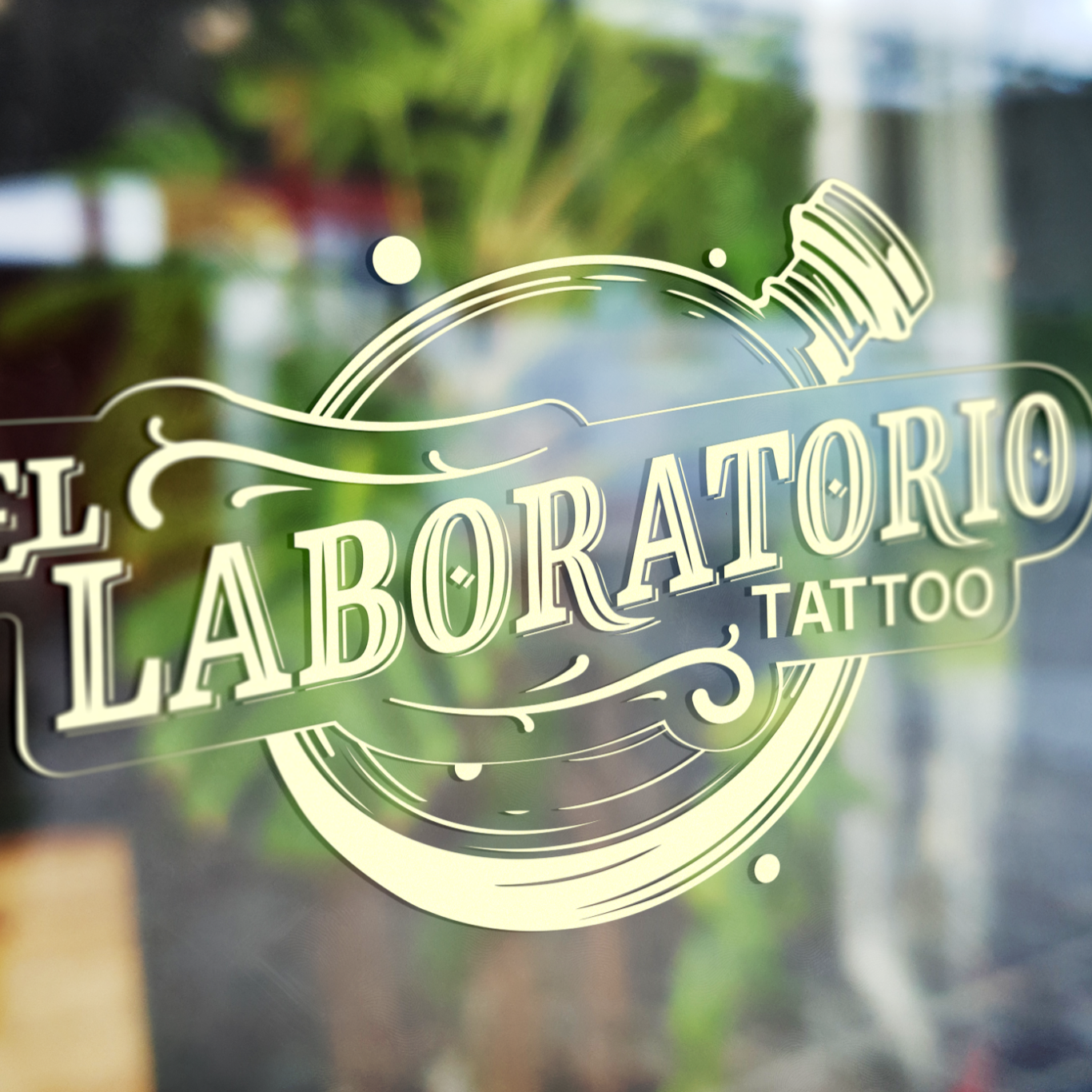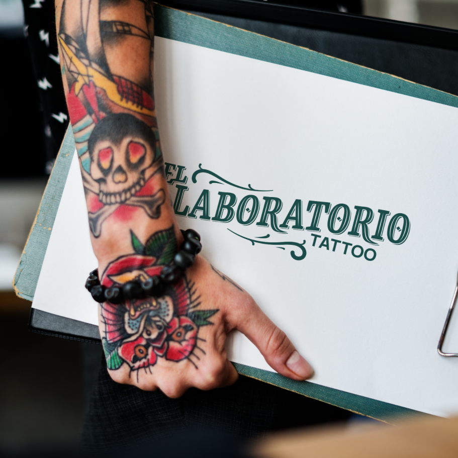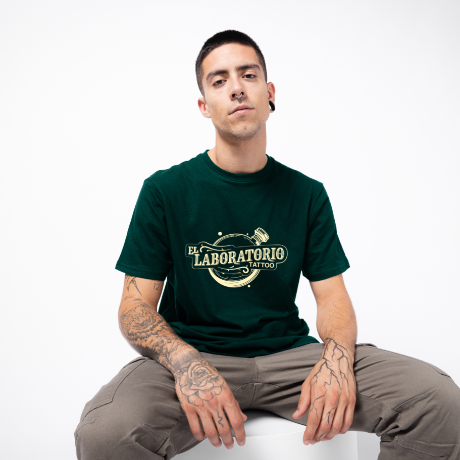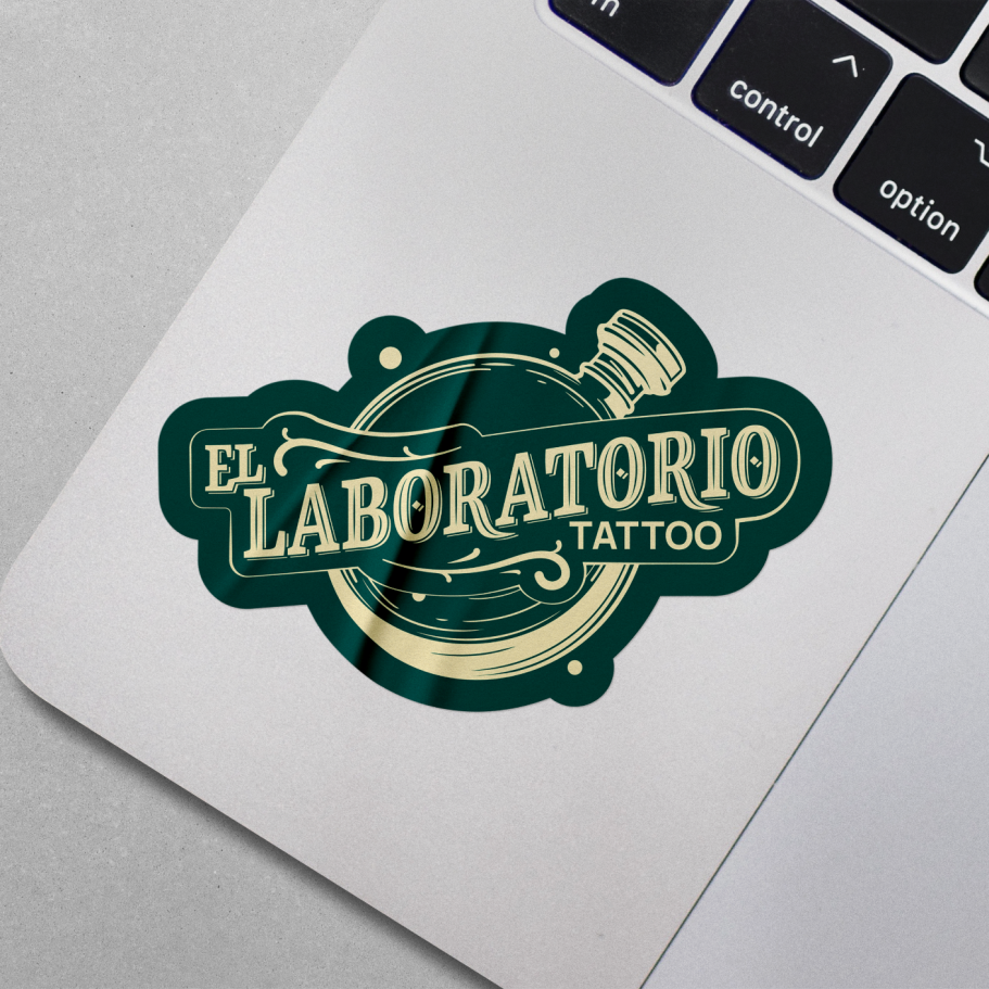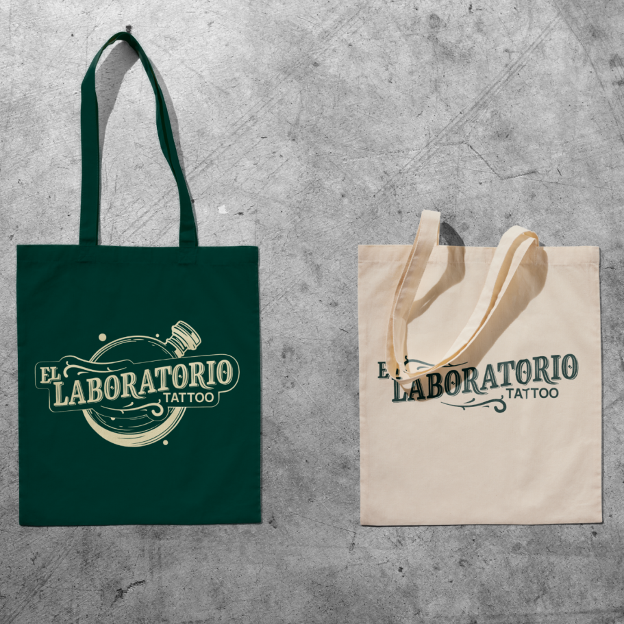 Creación de identidad visual, logotipo y merchandising para un estudio de tatuaje. El sistema combina un naming en lettering con la iconografía de un frasco de laboratorio, reforzando la idea de precisión, experimentación y arte. La paleta en verde bosque y amarillo pálido aporta personalidad y contraste.