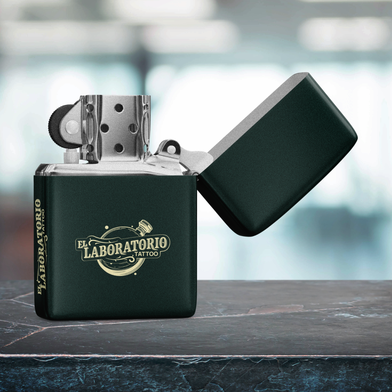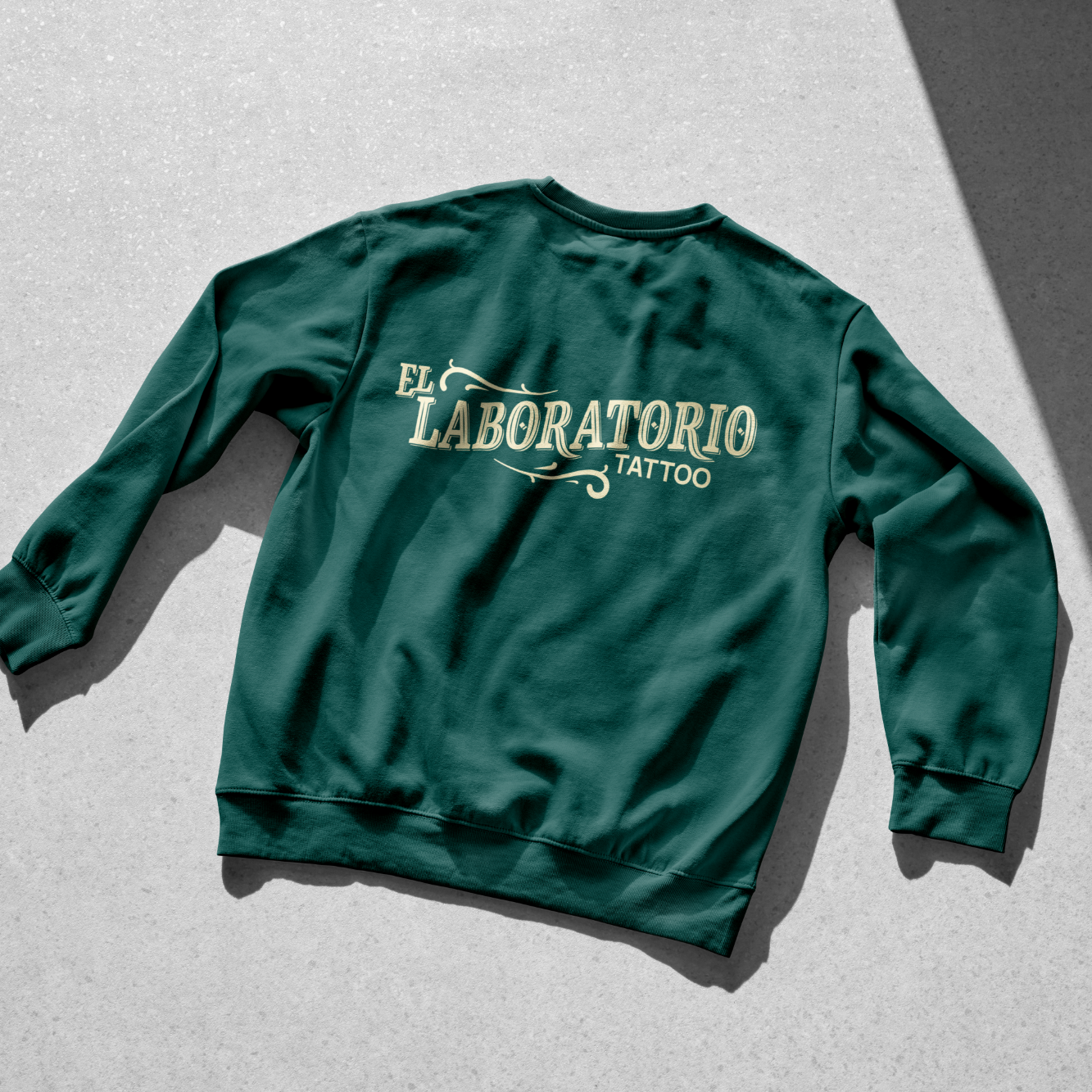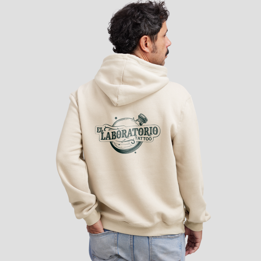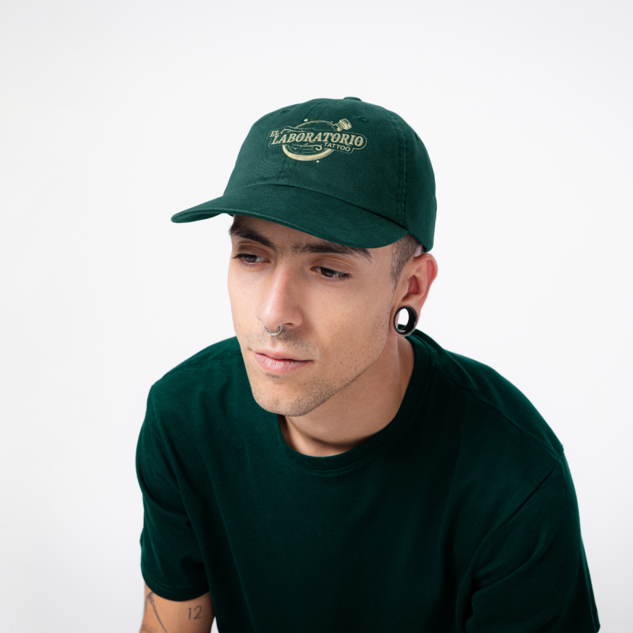Creación de identidad visual, logotipo y merchandising para un estudio de tatuaje. El sistema combina un naming en lettering con la iconografía de un frasco de laboratorio, reforzando la idea de precisión, experimentación y arte. La paleta en verde bosque y amarillo pálido aporta personalidad y contraste.