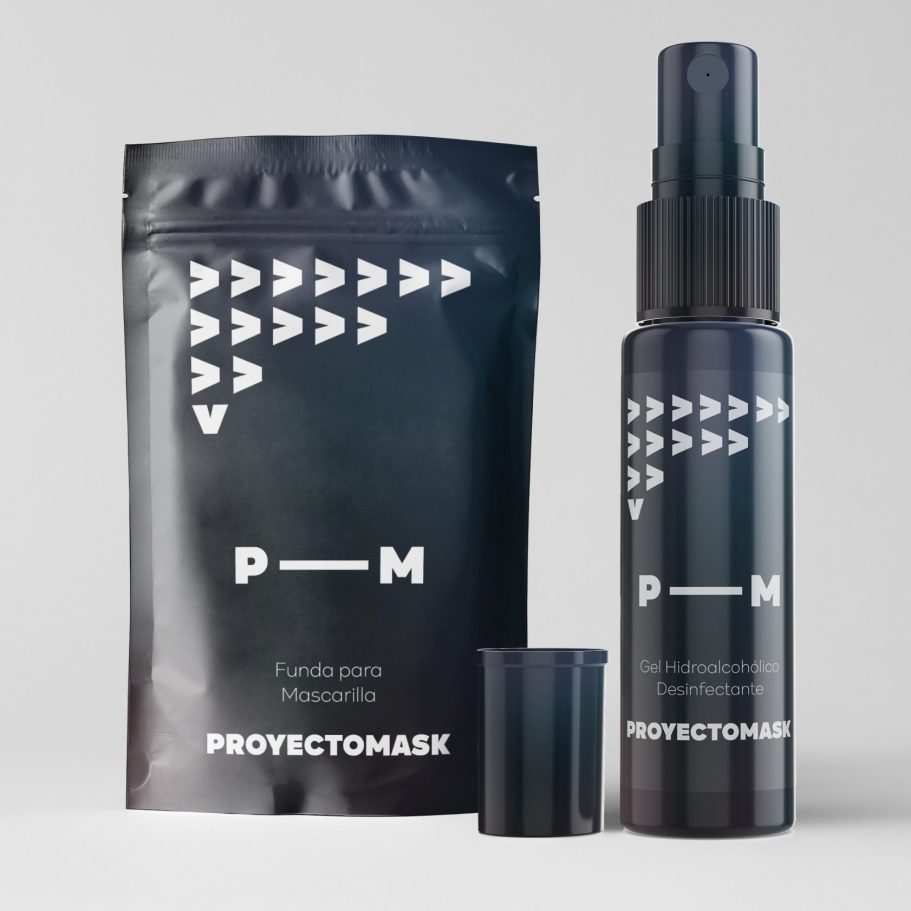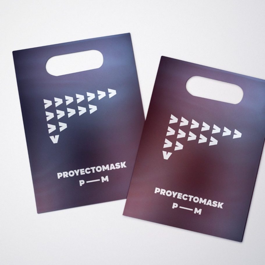 Identidad visual conceptual nacida durante la pandemia del Covid-19. El proyecto desarrolla una funda para mascarilla con una estética oscura y digital: fondo negro con degradado morado, tipografía grotesca sans serif en blanco y el glifo “>” como símbolo de avance, dirección y transformación.